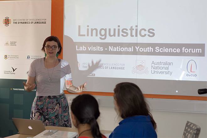 | Hedvig Skirgård från Lingolympiaden föreläser om lingvisitk på mässa för unga forskare i Australien. |